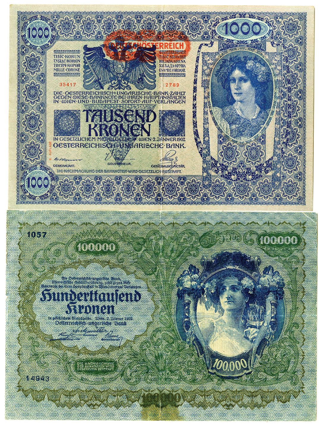 Austria..... 2 pieces: Austro-Hungarian Bank, 1902, 1000 Kronen, P-8a, Issued Banknote, Blue text on gray underprint, Extra Fine condition; and Austrian Government, 1922, 100,000 Kronen, P-81, Issued banknote, Blue and green, VF condition with a Repaired Tear. (2)