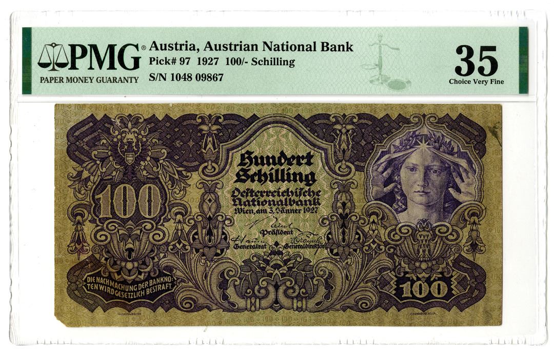 Austria. 1927. 100/- Schilling, P-97, issued banknote, PMG Graded Choice Very Fine 35 with comment "Corner Missing, Tears".