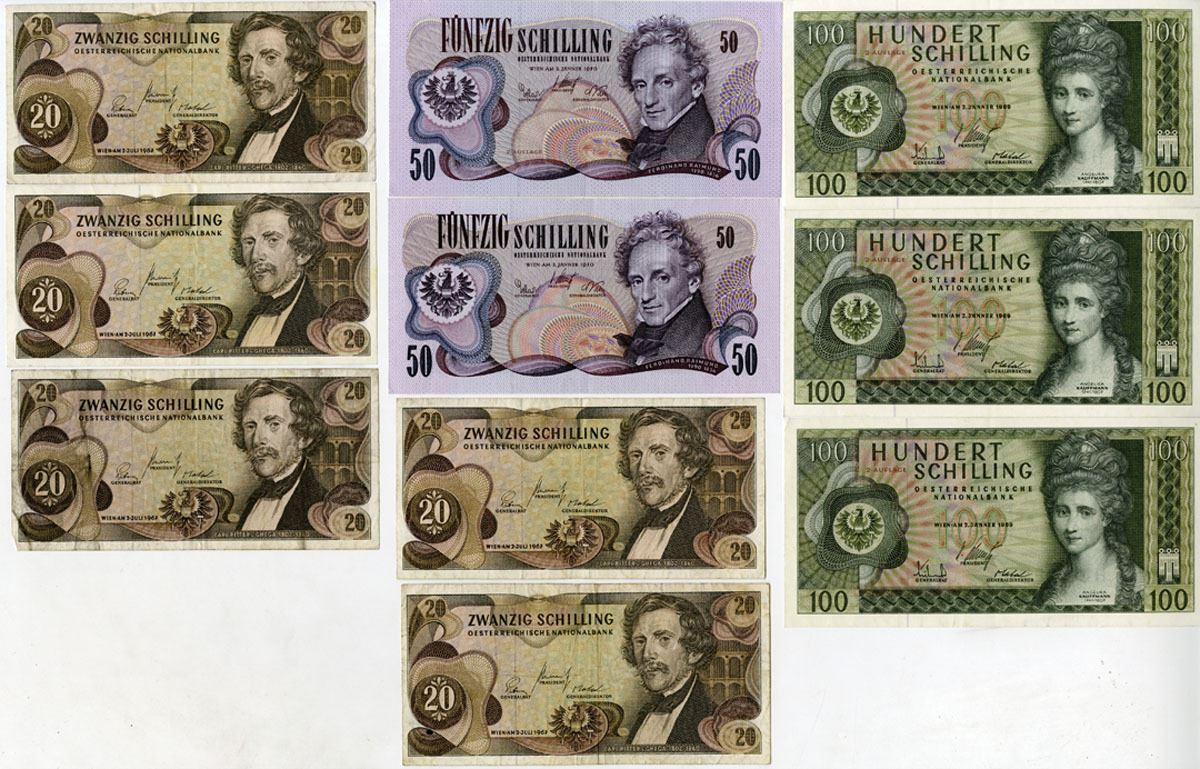 Austria, 1968 to 1972. Lot of 10 Issued Banknotes, Includes: 20 Schilling, P-142a (5), VF to Choice VF; 50 Schilling, P-143a; 50 Schilling, P-144, AU to Choice AU condition; and, 100 Schilling, P-146a (3), AU to Choice AU condition. (10). Sold "AS IS" no returns accepted.
