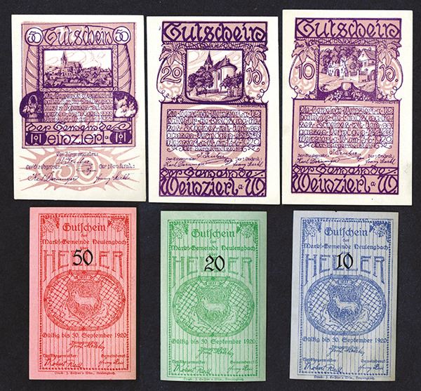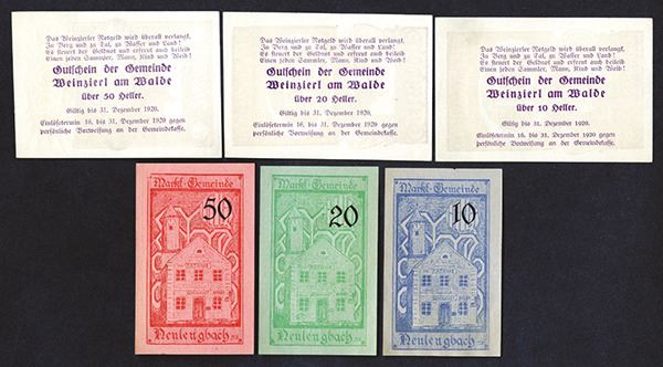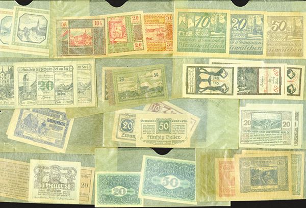 Austria - Notgeld. 10 Heller thru 1 Krone, 1920. Includes short sets from: Hinterbruhl, Kirchschlag, Korneuburg, Krems, Kurnberg, Laimbach, Langenlois, Larenburg, Lend, Lilienfeld, Lunz, Mannersdorf, Marbach, Mitterhausleiten, Modling, Neuhosen, Neukirchen, Neumarket, Neutengbach, Nochling, Oberhollabrunn, Persenbeug, Petzentuchen, Pochlarn, Poggstall, Stein, Stockerau, Stossing, Strasswalchen, Thalgau, Thermalbad, Wachau, Wald, Wechling, Weinzierl, Weissenkirchen, Wiener-Neustadt, Wein, Wilhelmsburg, Ybbs, Zehetgrub, Zelking, Zell, and others. In a few cases there are multiple sets (of different designs) from the same location. Extremely Fine to Uncirculated, mostly the latter, just one or two with a tear. Over 165 pieces.