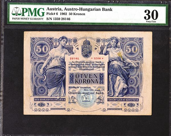 Austria. 50 Kronen, P-6, Issued banknote, Blue on rose underprint, seated allegorical women flank title and arms, , S/N 28146-SZAM, Sharp Corners. PMG graded Very Fine 30. Scarce note.