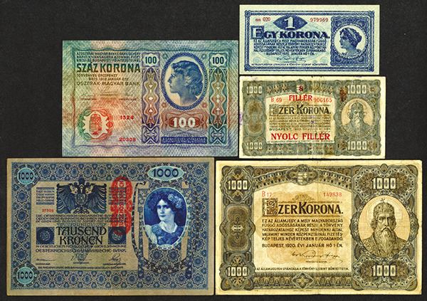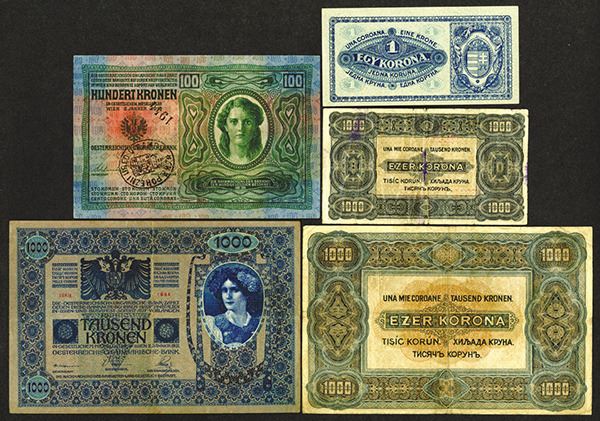 Hungary. 1, 100, 1000 Korona. P-57, 66a, 75b; Austria. 100, 1000 Korona. P-12 with 1944 hand stamp; 59. Generally Fine to EF. 5 pieces.