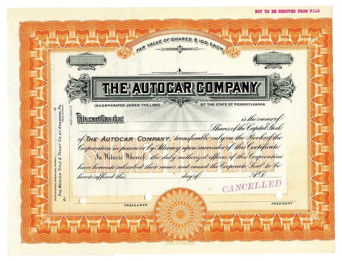 Pennsylvania, ND (1900-1920s). Odd Shares Specimen Capital Stock Certificate, Black text with orange border and underprint. Cancelled stamp near bottom right, "Not to be Removed" stamp at top right corner, POCs. The Autocar Company is an American specialist manufacturer of severe-duty, Class 7 and Class 8 vocational trucks, with its headquarters in Birmingham, Alabama. Started in 1897 in Pittsburgh, Pennsylvania, as a manufacturer of Brass Era automobiles, and trucks from 1899, Autocar is the oldest surviving motor vehicle brand in the Western Hemisphere.