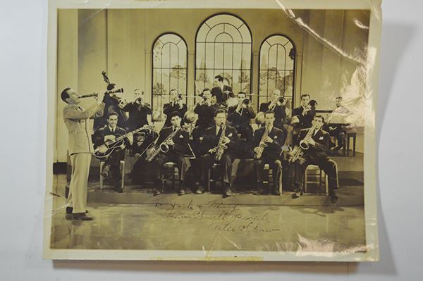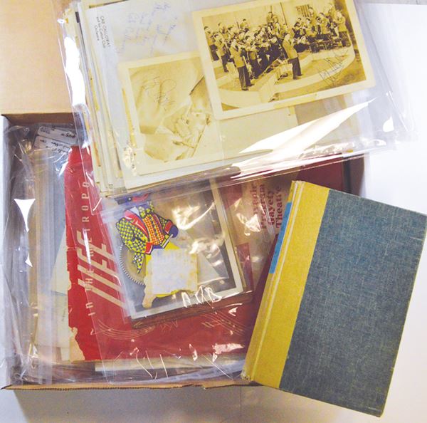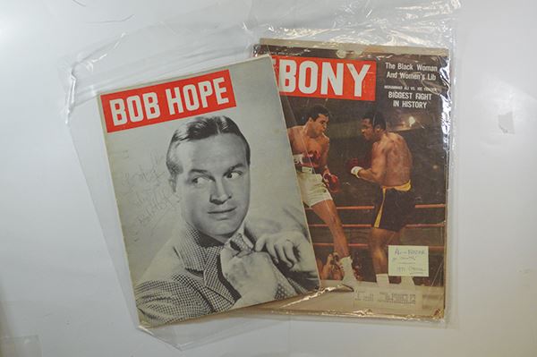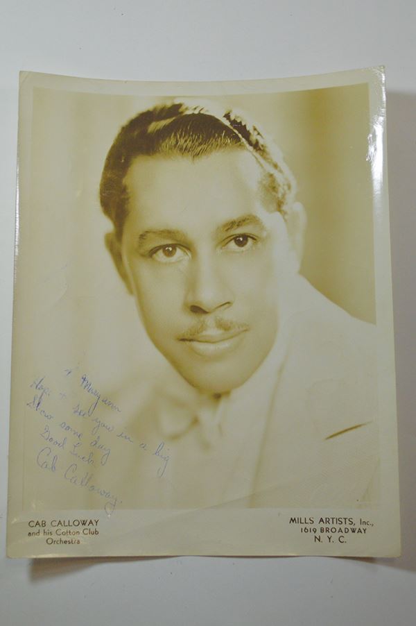 Photos include Glenn Miller (2), Cab Calloway, Artie Shaw, Nat King Cole, The Four Ink Spots, Vic Hyde, Bill Stern, Stanley Burns and Willie, Hal McIntyre, Jerry White, Loraine Vernon, Winnie Garrett, Peter Chan (Hellz Poppin background, 1938-41), Bob Howard, Billy Mahoney, Dave Barry, Penny Parker, A Robbins (Banana man), Fifi d'Orsay, Chuckie & Earl (Four Earls), Stuart Foster, Dorothy Rae, Bob Douglas, Bob Hope and Les Brown, plus a few others. Many are inscribed and personalized, others like Abbott and Costello are secretarial, just a few are not autographed (and thus not listed here). 8x10s and smaller. Nearly all with tape, a few with tape removal damage. 36 pieces. In addition of bunch of signed letters including Arthur Murray, Drew Pearson, Arthur Hailey, Aaron Copeland, Melville Cane and others. In addition is a small group of black related comic items, programs from the Latin Quarter, Gene Laverne's Jamboree and an Ebony magazine featuring the Ali-Frazier fight of 1971. Finally a signed and inscribed copy of Twilight of the Sea God by Thaddeus V. Tuleja, 1957. W.W. Norton First Edition (1958).