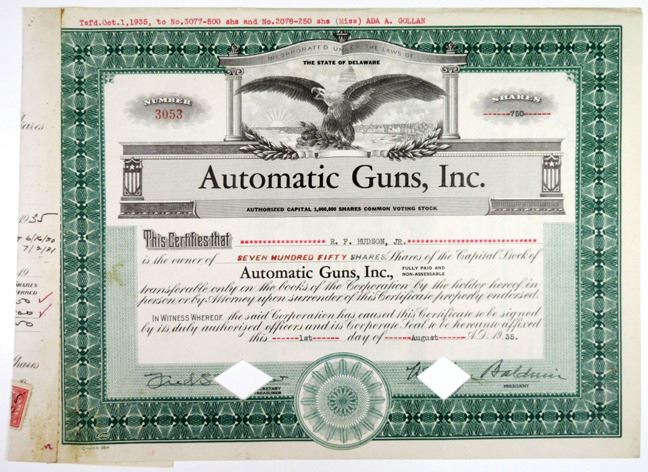 DE. 750 shares, I/C (Cut outs in signatures), Black on green border, eagle on top, S/N 3053, VF condition with counterfoil on left, the company owned patents on machine guns.