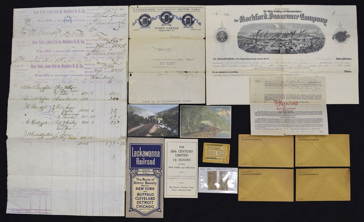 Various States..., Lot of 16 pieces of early automobile and railroad-related ephemera. Includes a 1926 Studebaker purchase invoice from Funk's Garage in White Haven, Pennsylvania, for a Standard Six Sedan ($1425), with detailed letterhead illustrating Studebaker’s “Big Six,” “Special Six,” and “Standard Six” models, showing radiator grills and headlamps. Also included are 15 railroad items dating from ca.1884 to 1936, featuring postcards, train tickets, waybills, maps, and timetables. Highlights include: a 1936 Lackawanna Railroad timetable with ornate illustrated map; a 1932 New York Central Hudson Division timetable; Staten Island Rapid Transit ticket pair ca.1880–90s; three different 1884 N.Y. Lake Erie & Western R.R. Co. waybills; and two railroad postcards ca.1920–30s, among others. Conditions range from Fine to XF. (16). Sold “AS IS,” no returns accepted.