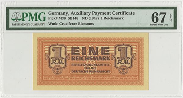 Germany, Wehrmacht, (1942), 1 Reichsmark notes, P-M36, SB146, brown on orange-brown underprint, featuring eagle with small swastika in underprint at center. PMG graded Superb Gem Uncirculated 67 EPQ, this is the highest graded note offered at auction over the last 12 years.