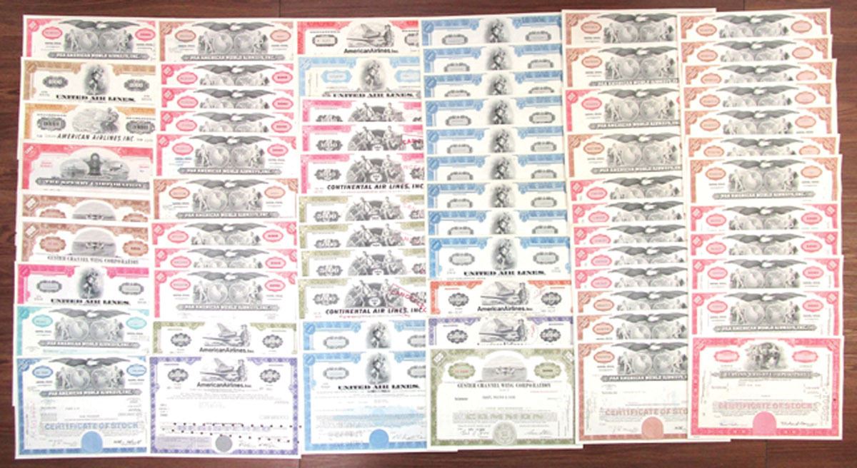 Lot of 65+ Stock and Bond Certificates, Highlights Include: Curtiss-Wright Corp., Pan American World Airways, Inc., United Air Lines, Continental Air Lines, Inc., American Airlines, Inc. and more. Certificates range from Fine to VF+ condition. (67). Sold "AS IS" no returns accepted.