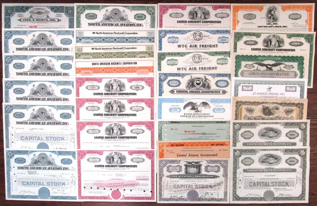 Delaware, Ohio, Florida, California, Wisconsin, ca.1920-97. Lot of 29 I/C, Certificates, Highlights Include: North American Rockwell Corp. (3); North American Aviation, Inc. (8); United Aircraft Corp. (6); WTC Air Freight (2); and more. Some are I/C, I/U, Certificates range from Fine to Uncirculated condition. (29). Sold "AS IS" no returns accepted.