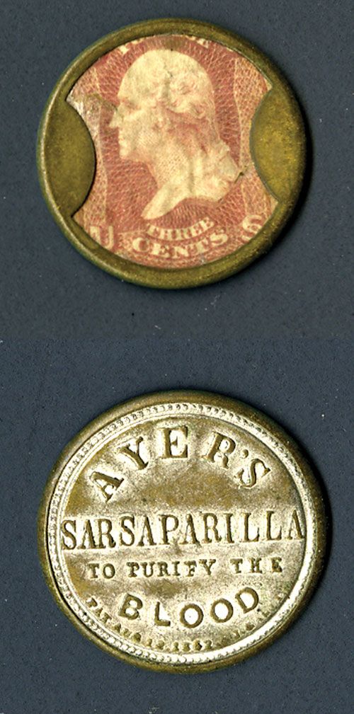 Ayer's Sarsaparilla “To Purify the Blood”, 3 cent stamp, mica intact but with crazing, slight silvering on the back, VF to XF condition, attractive encased postage in better condition than usually found.