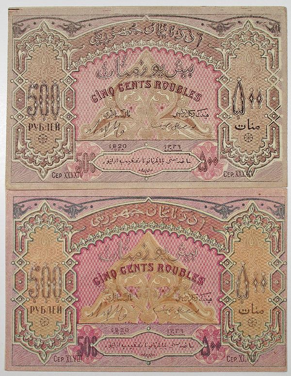 Azerbaijan. Lot includes a pair of 500 Roubles, 1920, P-7, one Series XXXXIV the other Series XLVIII, color difference evident between both prints. XF to About Unc. (2)
