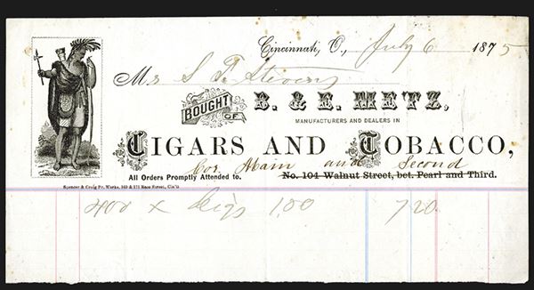 Ohio. Receipt. Standing Indian at left. 1875. Cincinnati, Ohio. Lightly spotted at top.