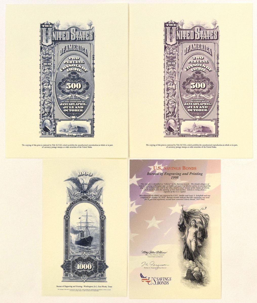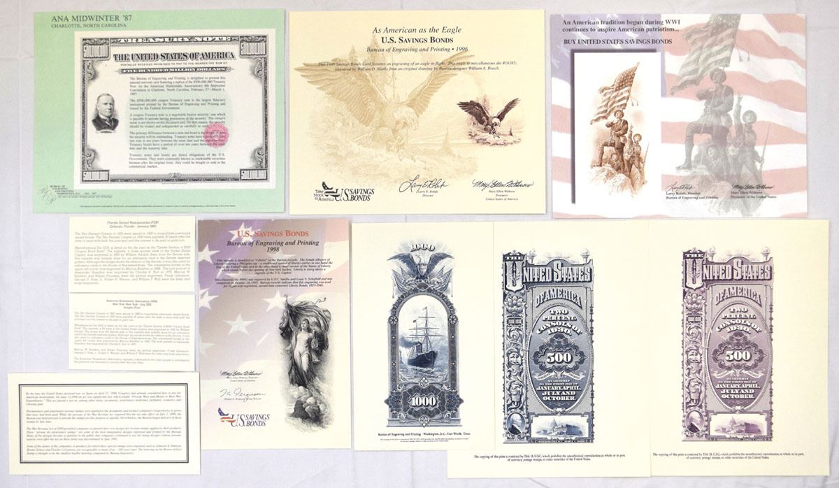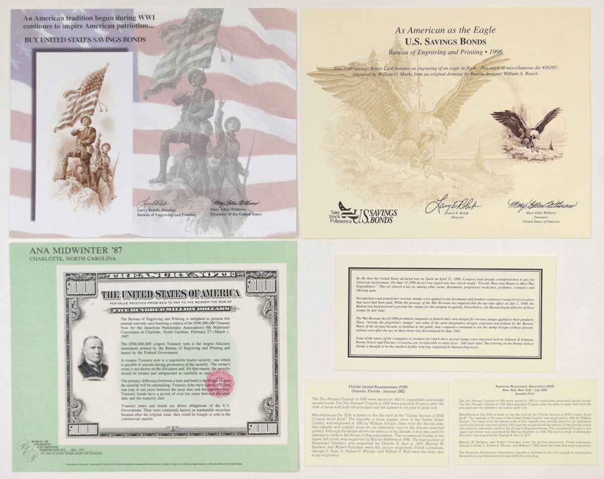 Florida, New York, North Carolina, Washington D.C., 1987-2002. Lot of 7 Souvenir Cards and 3 Informational Cards all relating to U.S. Savings Bonds, Includes: American Numismatic Association Midwinter Show in Charlotte, North Carolina - February/March 1987, $500,000,000 Treasury Note; 1996 Savings Bond Card with vignette of Eagle in Flight; U.S. Savings Bond, 1998, Vignette of "Liberty" used on Liberty Bonds; Florida United Numismatists in Orlando Florida - January 2002, 2% Consols of 1930 with center section of $500 Coupon Bond Back in blue; American Numismatic Association in New York, New York - July 2002, 2% Consols of 1930 with center section of $500 Coupon Bond Back in Purple; Card with $1000 denomination at top and bottom with ship and eagle printed in blue; Card with Trio of Soldiers to urge people to buy savings bonds; Souvenir Card information card regarding War Revenue Act of 1898. All are Gem Uncirculated. BEP. (10). Sold "AS IS" no returns accepted.