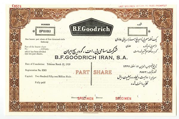 Iran. Lot includes a specimen certificate for "Part Share", s/n OP0000, stamped "Last Specimen Return to Files Promptly", Farsi and English text on back, ABNC. The Goodrich Corporation, formerly the B.F. Goodrich Company, was an American manufacturing company based in Charlotte, North Carolina. Founded in Akron, Ohio in 1870 as Goodrich, Tew & Co. by Benjamin Goodrich, the company name was changed to the "B.F. Goodrich Company" in 1880. In 1959, the company setup a tire factory in Iran. The name was changed again to BFGoodrich in the 1980s, and to "Goodrich Corporation" in 2001. Originally a rubber manufacturing company known for automobile tires, the company diversified its manufacturing businesses throughout the twentieth century and sold off its tire business in 1986 to focus on its other businesses, such as aerospace and chemical manufacturing. The BFGoodrich brand name continues to be used by Michelin, who acquired the tire manufacturing business in 1988.. About Unc.