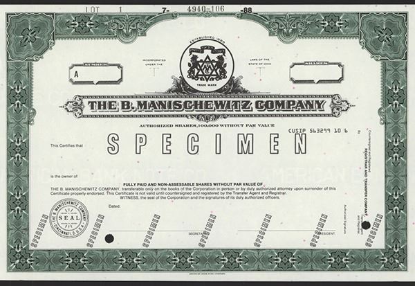 Ohio. Odd Shares Specimen Stock Certificate. Black print with green border and under print. Company logo at top center of certificate, a Jewish Star flanked by two lions of Judah with Hebrew writing above which translates to "Next Year in Jerusalem." Black SPECIMEN overprints, POC's, VF-XF condition, ABNC. Well known Kosher food and wine manufacturer.