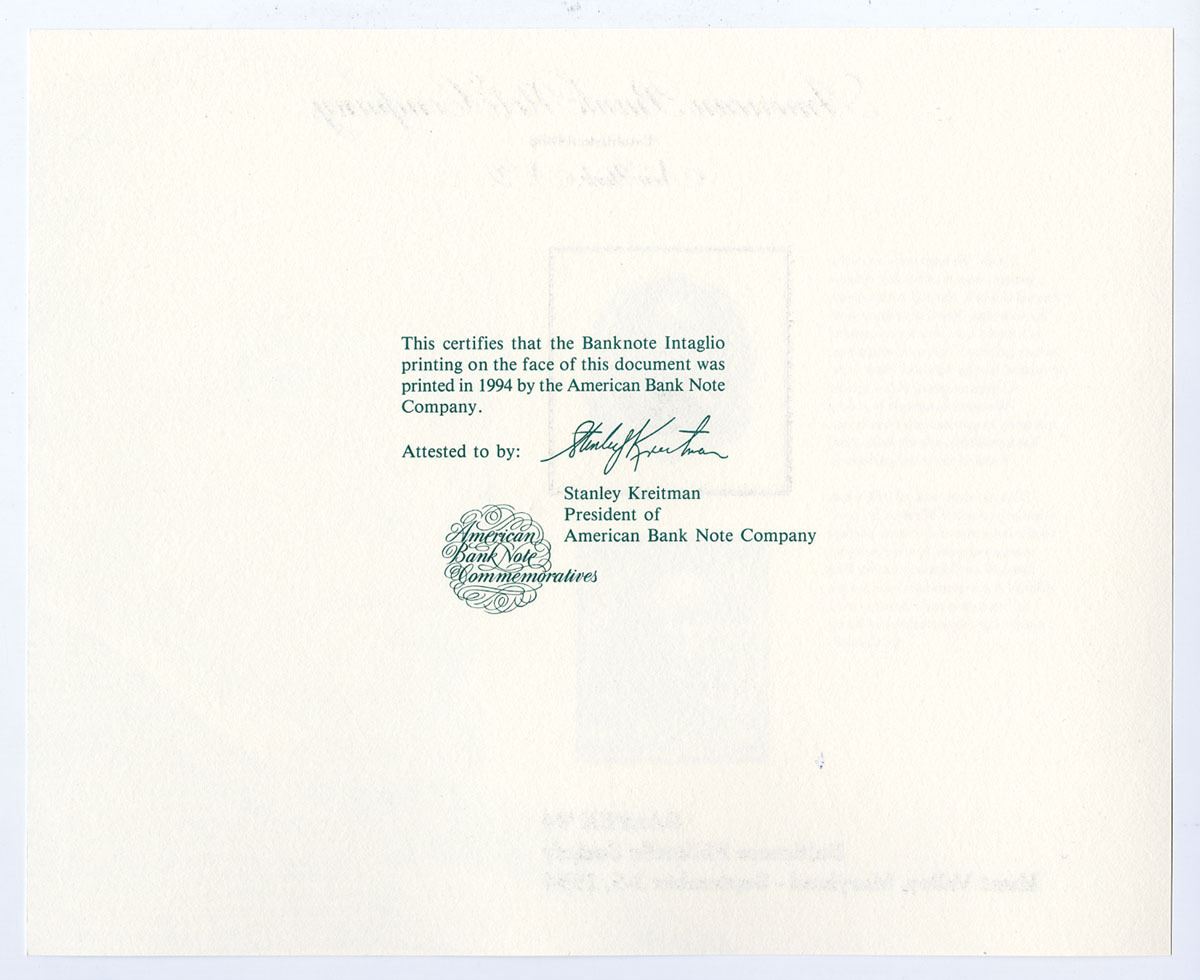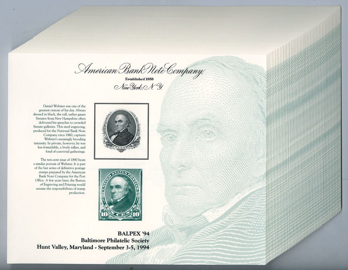 MD. Baltimore Philatelic Society, Hunt Valley, Maryland September 1994. 10 Cent reproduction of 1890 postage stamp with portrait of Daniel Webster. Webster, the Senator from New Hampshire. The engraving used for the stamp was done in 1860 for the National Bank Note Co. The ten cent issue of 1890 bears same portrait. It is part of the last series of definitive postage stamps prepared by the ABNC for the post office. Uncirculated, ABNC. 50 Pieces