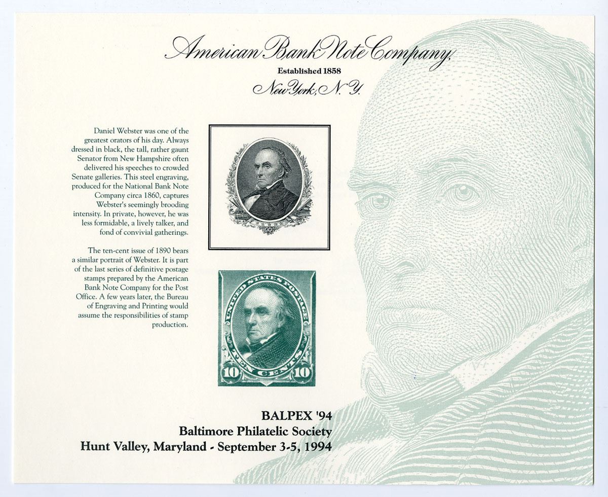 MD. Baltimore Philatelic Society, Hunt Valley, Maryland September 1994. 10 Cent reproduction of 1890 postage stamp with portrait of Daniel Webster. Webster, the Senator from New Hampshire. The engraving used for the stamp was done in 1860 for the National Bank Note Co. The ten cent issue of 1890 bears same portrait. It is part of the last series of definitive postage stamps prepared by the ABNC for the post office. Uncirculated, ABNC. 50 Pieces