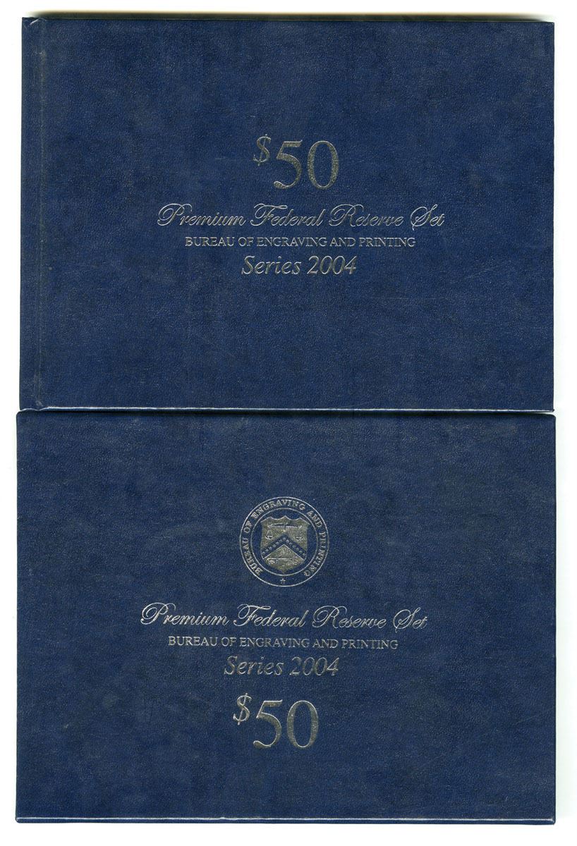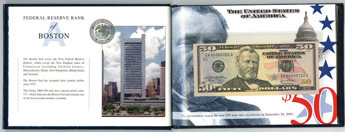 U.S., Lot of 12 notes with matching Serial numbers. All twelve $50s have serial number 00000753A. They come with a slipcase booklet that includes a BEP Certificate of Authenticity. Each Federal Reserve Bank is described and pictured. This BEP premium product was limited to 500 sets and its purpose was to celebrate the new colorized big head $50s. All are in Gem to Superb Gem Uncirculated condition. (12 notes in 1 book)
