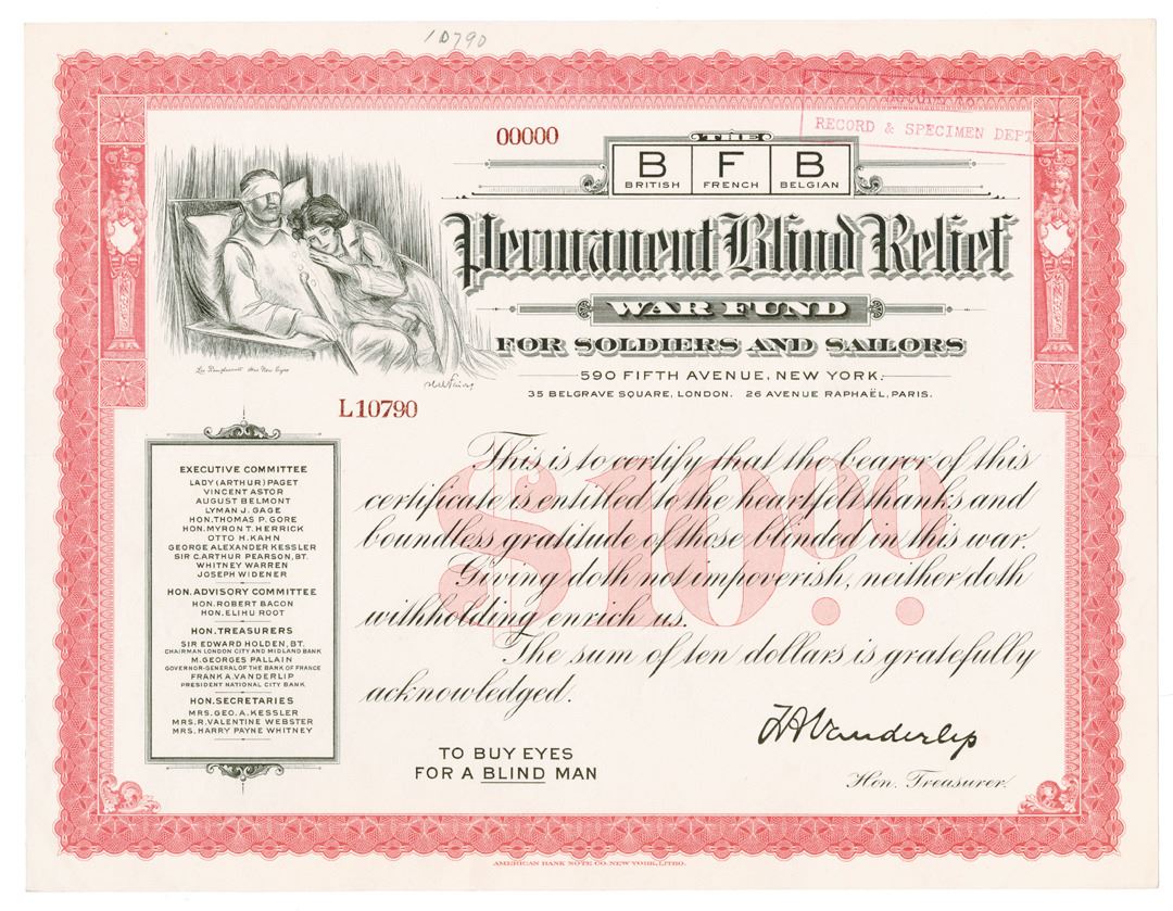 New York. $10 Specimen Donation Certificate, B-F-B stood for British, French and Belgian Black print on red border and under tint, Company title at top with drawing of a nurse leaning on shoulder of blinded man, Return to Record & Specimen Dept. stamp at top, VF-XF condition, ABNC. In 1915 the American merchant George Kessler and his wife, Cora Parsons Kessler, organized in Paris the British, French, and Belgian Permanent Relief War Fund. George Kessler had been aboard the Lusitania when it was sunk by a German torpedo. As a survivor, he vowed to help veterans in some way, eventually settling on helping those blinded in the war. He then recruited author and lecturer Helen Keller, who had been deaf and blind since childhood. The Kesslers and Keller worked together, forming an American branch of the Permanent Relief War Fund called the Permanent Blind Relief War Fund for Soldiers and Sailors of the Allies, which was incorporated in New York in 1919, with Keller and Cora Parsons Kessler as trustees. In the 1920s the organization began serving blind civilians, as well as military personnel, and also began printing texts in Braille. This prompted the 1925 name change to the American Braille Press for War and Civilian Blind. Under this name the organization was one of the leading publishers of Braille texts, and it was responsible for the first Òtalking bookÓ (1937). In 1946 the name changed yet again, to the American Foundation for the Overseas Blind, as its mission expanded to include rehabilitation of the blind.