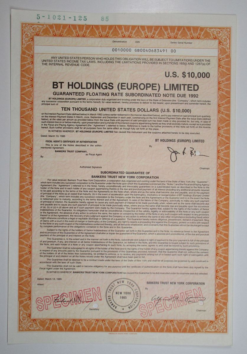 BT Holdings (Europe) Ltd., 1985 $10,000 Specimen Floating Rate Coupon Bond