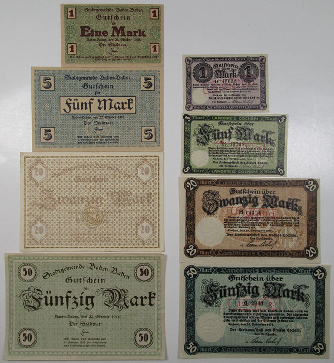 Germany. Lot includes 8 notes from Baden-Baden a quartet of 1, 5, 20, and 50 Mark; and a similar Notgeld quartet of 1, 5, 20, and 50 Mark from Cochem. About to Choice Unc. (8)