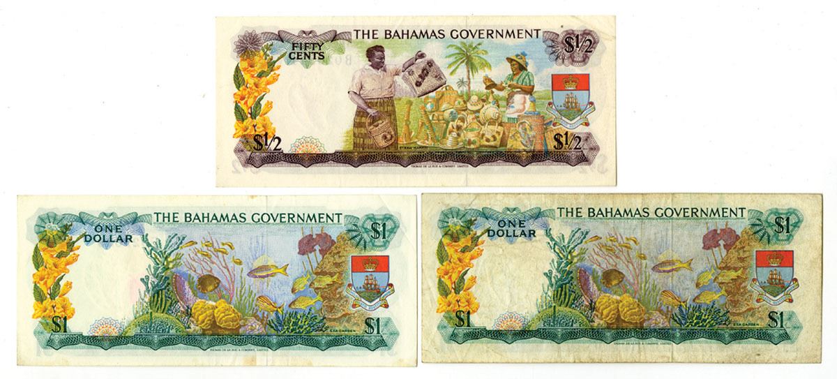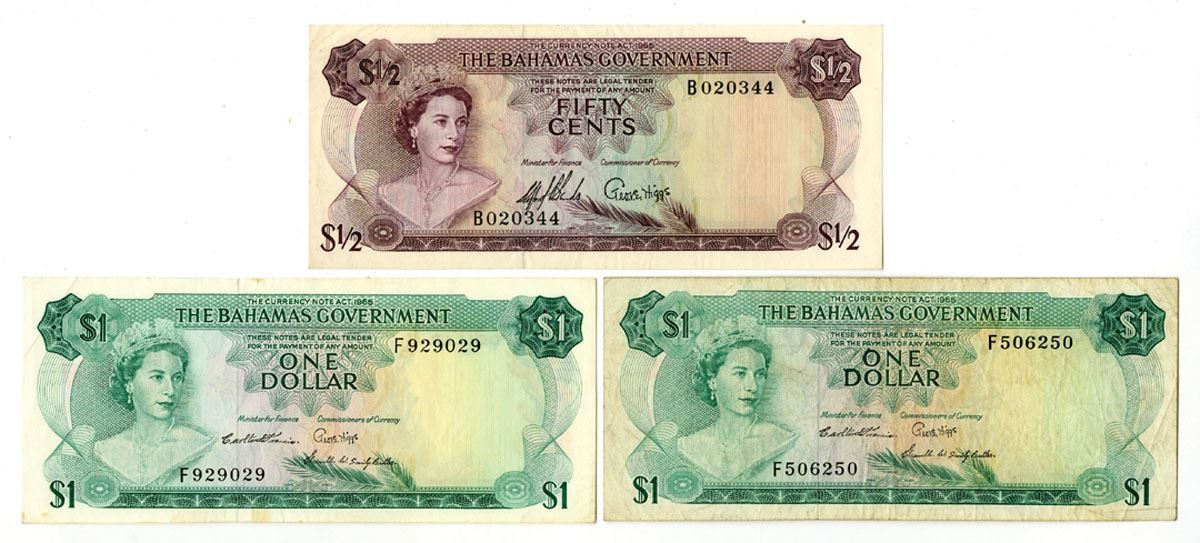 Bahamas, L.1965. Lot of 3 Issued Banknotes, Includes: 1/2 Dollar, P-17a, Purple on m/c, Queen Elizabeth II at left, Back is m/c with star market; 1 Dollar, P-18b (2), Green on m/c, Queen Elizabeth II at left, Back is m/c with shellfish and ocean life. Notes range from VF to AU condition. TDLR. (3). Sold "AS IS" no returns accepted.