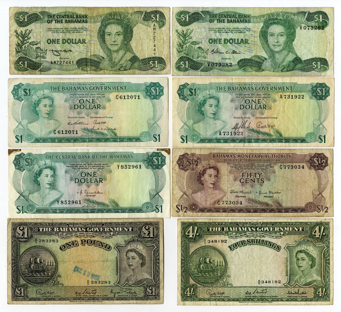 Bahamas, ca.1953-1984, Lot of 8 Issued Banknotes, Includes: Bahamas Government 4 Shillings, P-13c, ND (1953), TDLR; 1 Pound, P-15d, ND (1953), TDLR; 1 Dollar, P-18a & P-18b, L.1965, TDLR; Bahamas Monetary Authority 1/2 Dollar, P-26a, L.1968, TDLR; Central Bank of the Bahamas 1 Dollar, P-35a, L.1974, TDLR; 1 Dollar, P-43a & P-43b, L.1974 (1984), TDLR. Notes range from Fine to VF condition. (8). Sold "AS IS" no returns accepted.