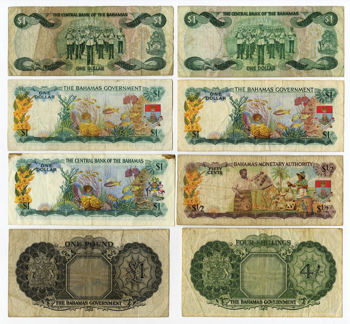 Bahamas, ca.1953-1984, Lot of 8 Issued Banknotes, Includes: Bahamas Government 4 Shillings, P-13c, ND (1953), TDLR; 1 Pound, P-15d, ND (1953), TDLR; 1 Dollar, P-18a & P-18b, L.1965, TDLR; Bahamas Monetary Authority 1/2 Dollar, P-26a, L.1968, TDLR; Central Bank of the Bahamas 1 Dollar, P-35a, L.1974, TDLR; 1 Dollar, P-43a & P-43b, L.1974 (1984), TDLR. Notes range from Fine to VF condition. (8). Sold "AS IS" no returns accepted.