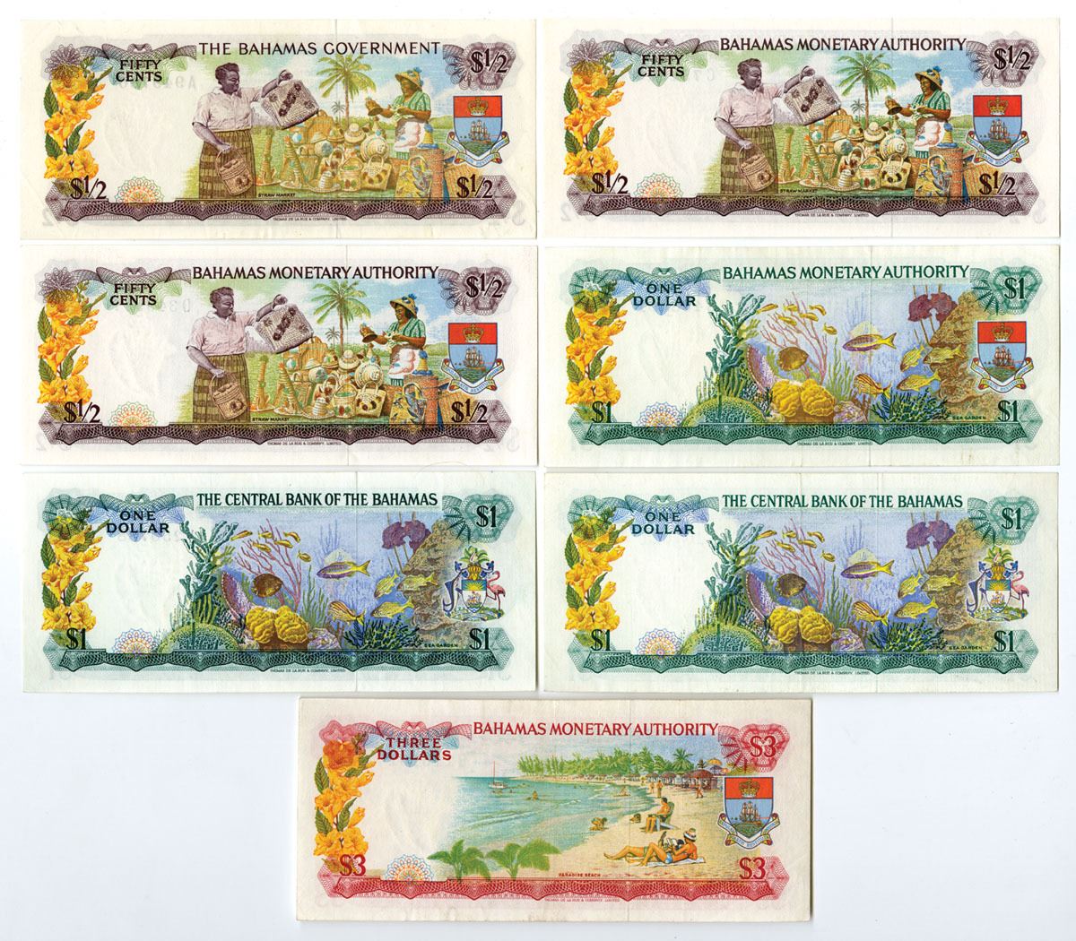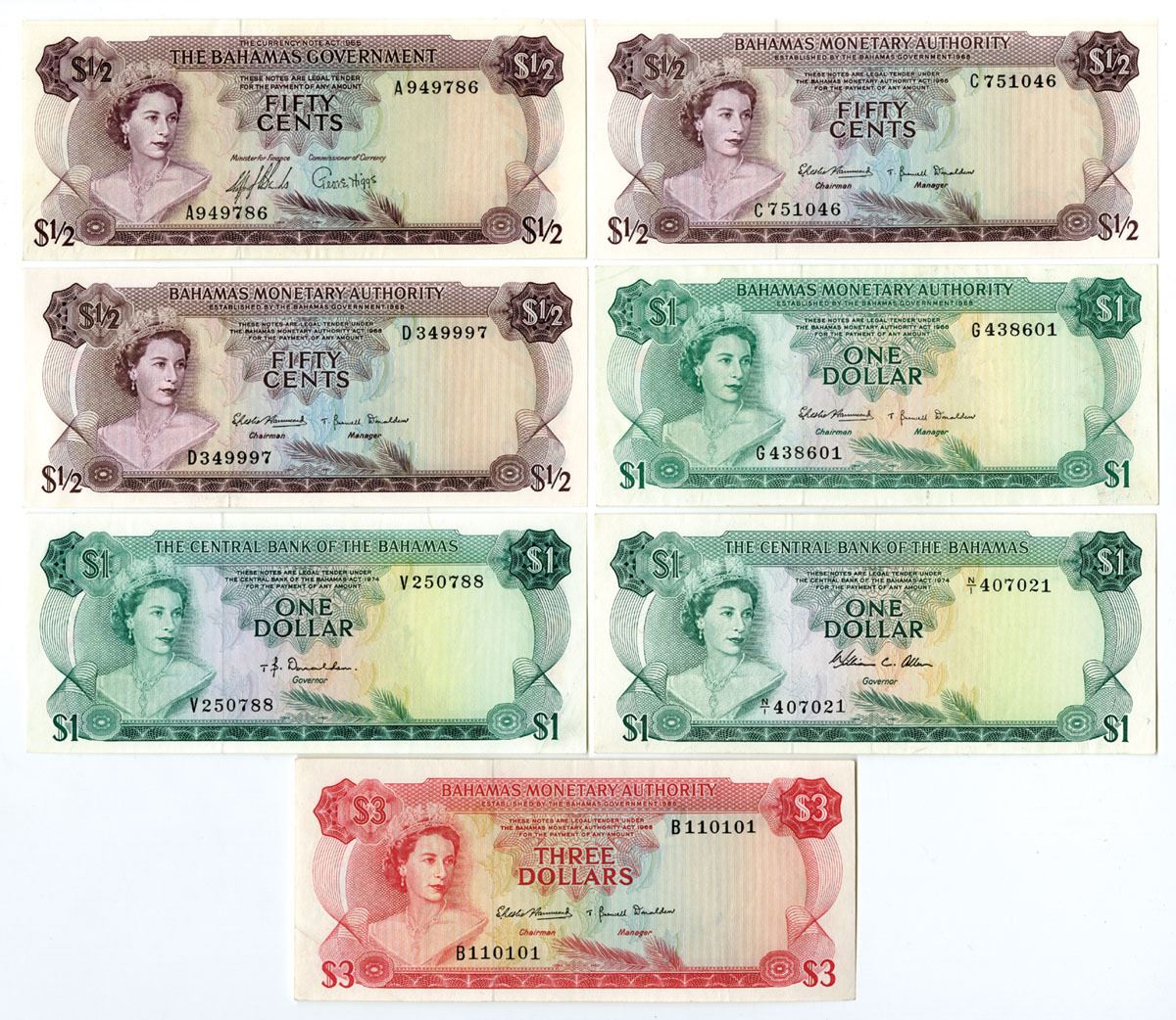 Bahamas...., 1965-74. Lot of 7 issued Banknotes from various issuers, Includes: Bahamas Government, L. 1965, 1/2 Dollar, P-17a; Bahamas Monetary Authority, L. 1968, 1/2 Dollar, P-26a (2); 1 Dollar, P-27a; 3 Dollars, P-28a; Central Bank of the Bahamas, L. 1974, 1 Dollar, P-35a & P-35b. Notes are VF to UNC condition, TDLR. (7). Sold "AS IS" no returns accepted.