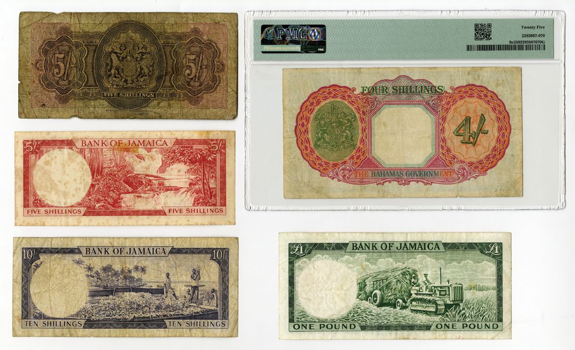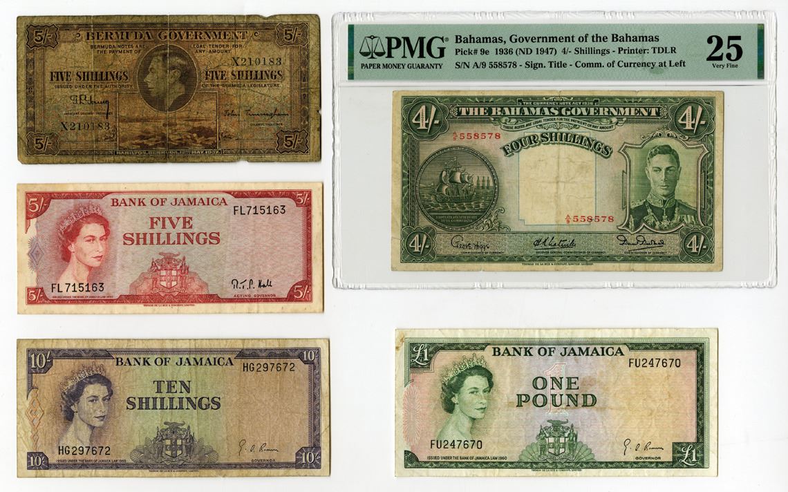 Bahamas, Bermuda, Jamaica, 1947 to 1960. Lot of 5 Issued Banknotes, Includes: Bahamas Government 4/- Shillings, P-9e, 1936 (ND 1947), PMG graded Very Fine 25, TDLR; Bermuda Government 5 Shillings, P-8a, 1937, Choice Good condition, BWC; Bank of Jamaica trio including 5 Shillings, P-51Ac; 10 Shillings, P-51Be; and 1 Pound, P-51Ce, L.1960 (1964), Choice Fine to Choice VF condition, TDLR. (5). Sold "AS IS" no returns accepted.