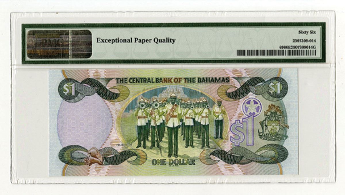 Bahamas. Central Bank, 2001.1 Dollar, P-69, Issued Note. PMG Gem Unc 66 EPQ