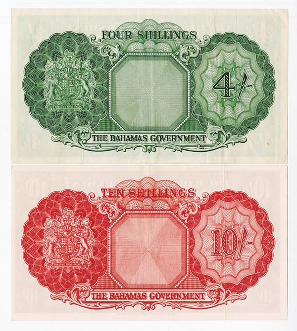 Bahamas. Lot includes 4 Shillings, 1953, P-13, Choice Very Fine, TDLR; and 10 Shillings 1953, P-14, Choice Extremely Fine. Both TDLR.