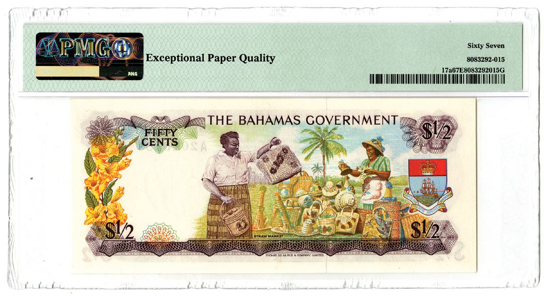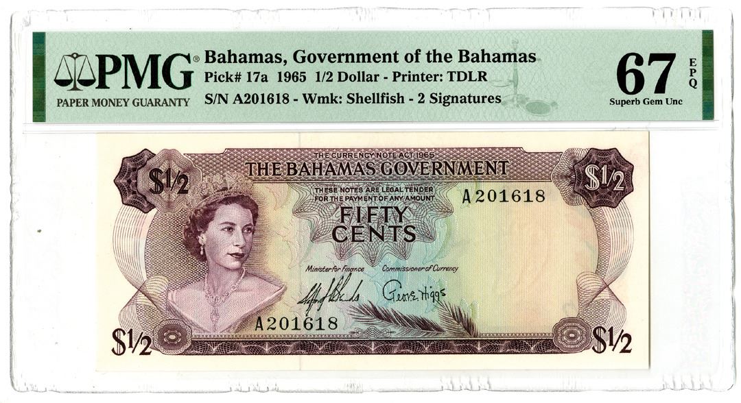 Bahamas. 1965. 1/2 Dollar, P-17a, issued banknote, Purple on m/c, Queen Elizabeth II at right, back m/c, 2 signatures, S/N A201618, PMG Graded Superb Gem Uncirculated 67 EPQ, TDLR.