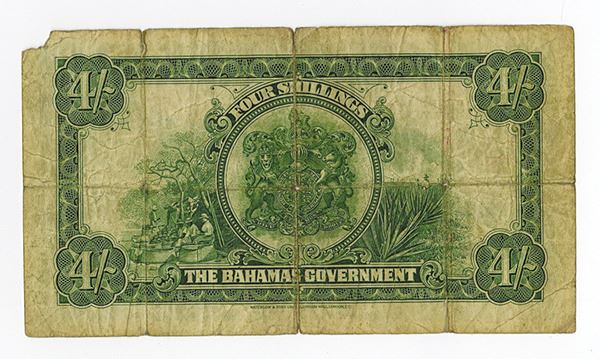 Bahamas, 4/- Shillings, P-5, Issued banknote, green on pink and m/c, King George V at right, palm trees with harbor scene and ship at left, back green, Choice VG to Fine with a small 2mm to 3mm piece of the top right corner tip missing, small edge tears on the top margin, still a very scarce note in any condition. W&S.