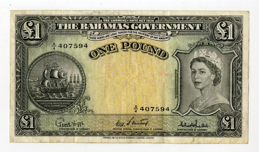 Bahamas, ND (1953). 1 Pound, P-15c, Issued Banknote, Black on orange and green underprint with Queen Elizabeth II at right and Ship seal at left, Back is black, S/N A/4 407594, VF-VF+ condition, TDLR.