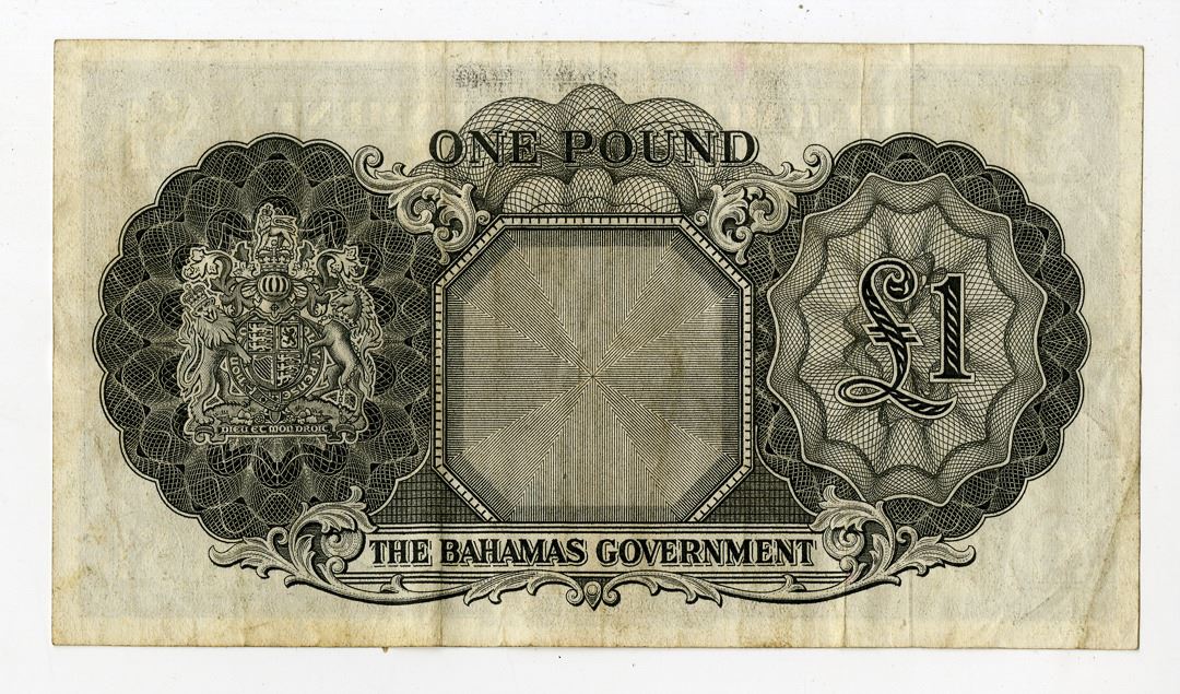 Bahamas, ND (1953). 1 Pound, P-15c, Issued Banknote, Black on orange and green underprint with Queen Elizabeth II at right and Ship seal at left, Back is black, S/N A/4 407594, VF-VF+ condition, TDLR.