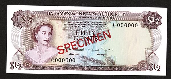 Bahamas. 1/2 Dollar. P-26s. Elizabeth II at left, straw market on back. Red SPECIMEN overprint on each side. TDLR. Very Choice Uncirculated.