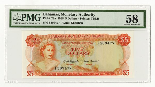 Bahamas, $5, P-29a, Issued banknote, Orange on m/c, S/N F 509477, PMG graded Choice About uncirculated 58, TDLR, attractive note that gives the appearance of a CU note.