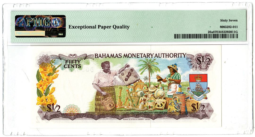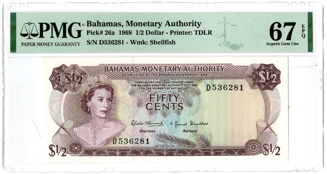 Bahamas. 1968. 1/2 Dollar, P-26a, Issued banknote, Purple and blue on face, S/N D536281, Watermark: Shellfish, PMG graded Superb Gem Uncirculated 67 EPQ.