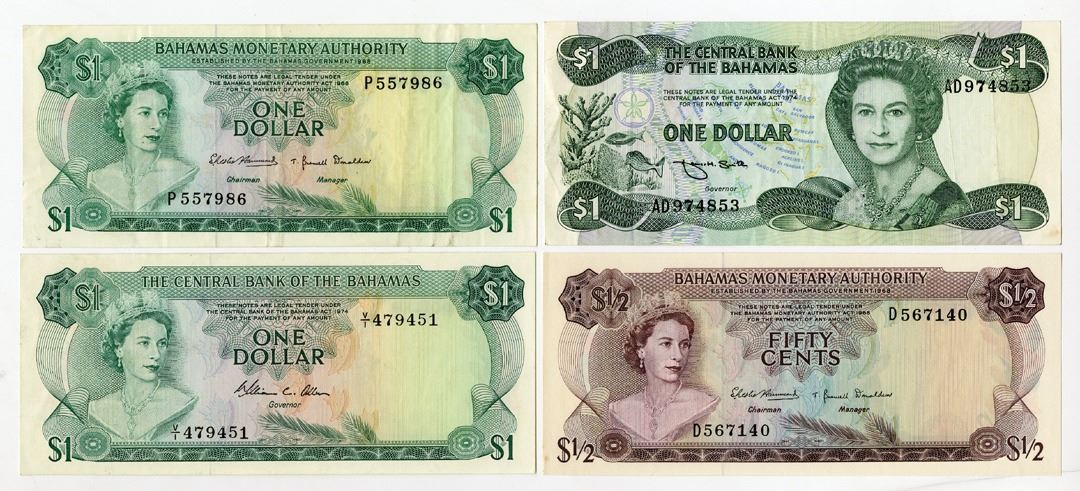 Bahamas, 1968-84. Lot of 4 Issued Banknotes, Includes: Bahamas Monetary Authority 1/2 Dollar, P-26a, L.1968, TDLR; 1 Dollar, P-27a, L.1968, TDLR; Central Bank of the Bahamas 1 Dollar, P-35b, L.1974, TDLR; 1 Dollar, P-43b, L. 1974 (1984), TDLR. Notes are XF-AU condition. (4). Sold "AS IS" no returns accepted.