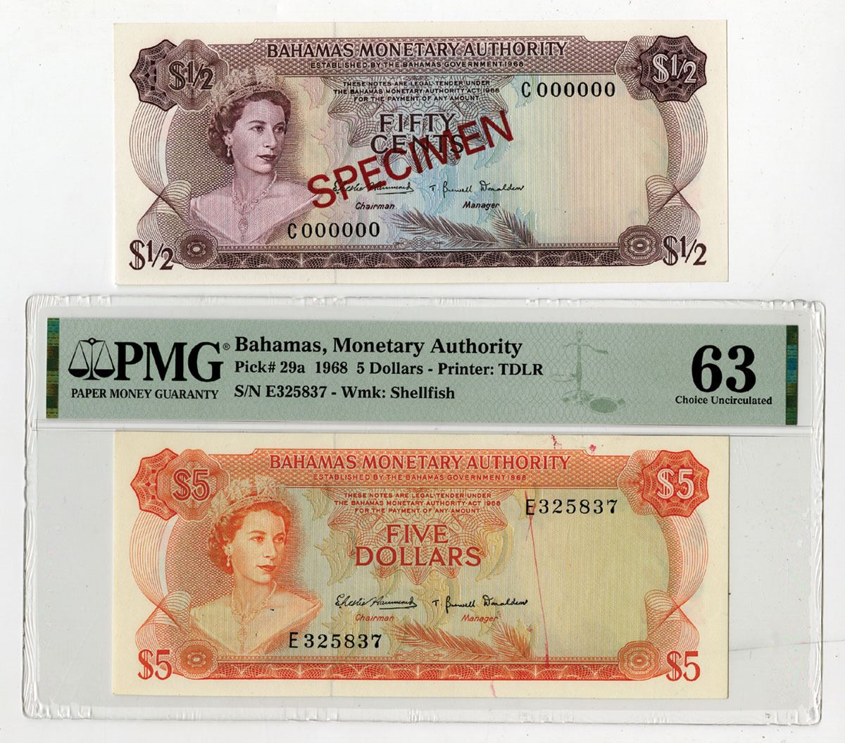 Bahamas, L.1968. Lot of 2 Banknotes, Includes: 1/2 Dollar, P-26s, Specimen Banknote, Purple on m/c underprint with Queen Elizabeth II at left, S/N C000000, Specimen overprints and POCs, XF to AU condition; 5 Dollars, P-29a, Issued Banknote, Orange on m/c underprint with Queen Elizabeth II at left, S/N E325837, PMG graded Choice Uncirculated 63 with comment "Ink." (2). Sold "AS IS" no returns accepted.