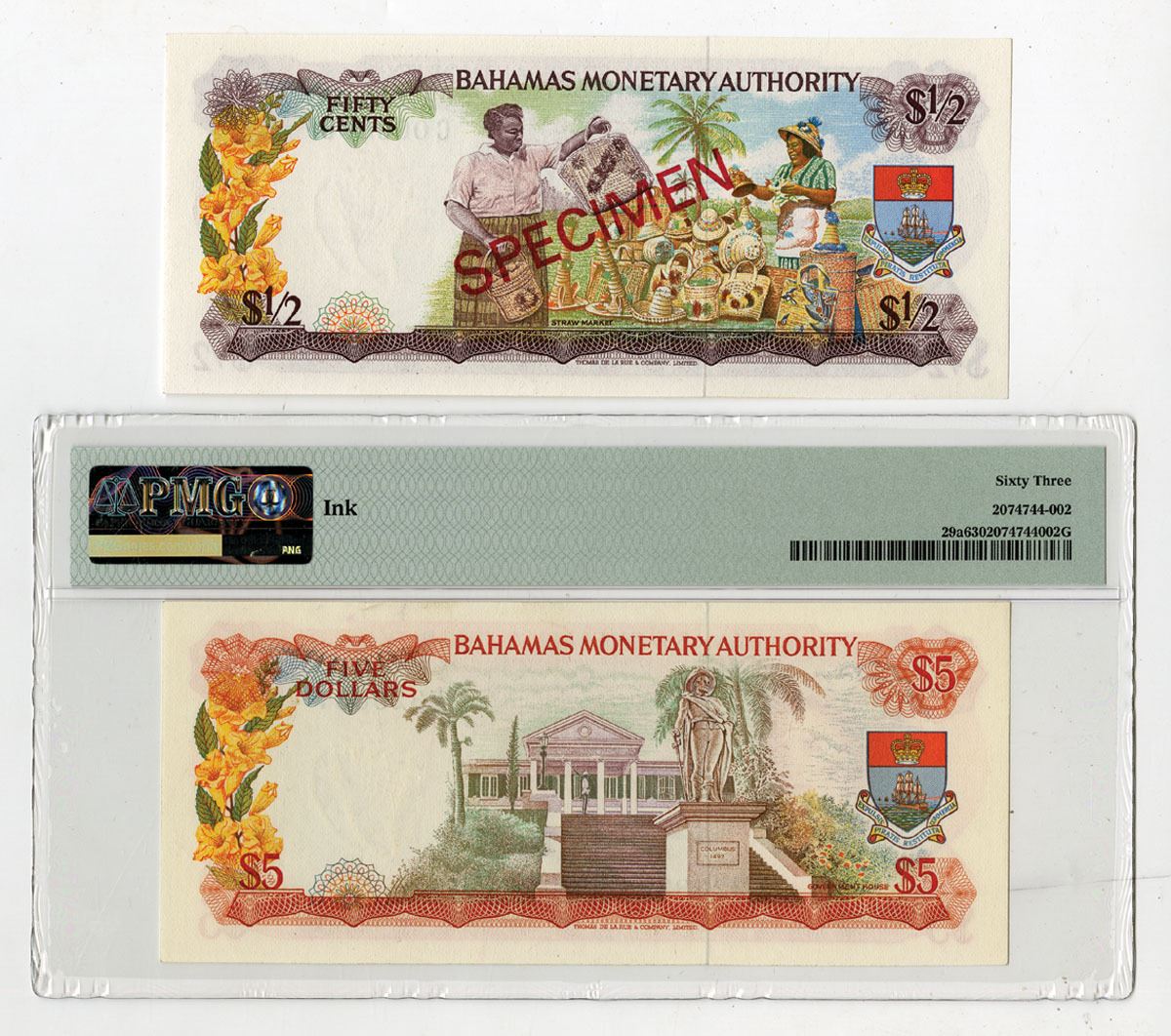 Bahamas, L.1968. Lot of 2 Banknotes, Includes: 1/2 Dollar, P-26s, Specimen Banknote, Purple on m/c underprint with Queen Elizabeth II at left, S/N C000000, Specimen overprints and POCs, XF to AU condition; 5 Dollars, P-29a, Issued Banknote, Orange on m/c underprint with Queen Elizabeth II at left, S/N E325837, PMG graded Choice Uncirculated 63 with comment "Ink." (2). Sold "AS IS" no returns accepted.