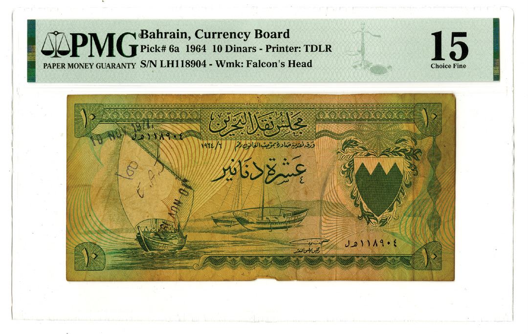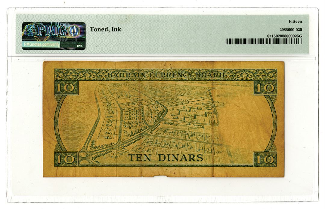 Bahrain, 1964. 10 Dinars, P-6a, Issued Banknote, Green on m/c underprint with Dhow at left and arms at right, S/N LH118904, Printer: TDLR, PMG graded Choice Fine 15 with comments "toned, ink."