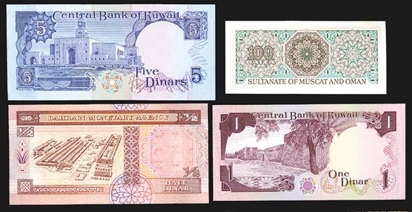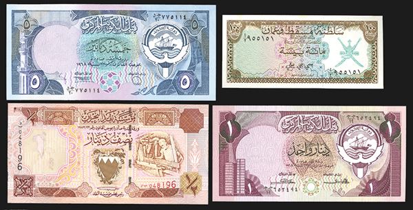 Bahrain 1/2 Dinar P-17; Kuwait 1, 5 Dinar; P-13a, 14a; Muscat and Oman 100 Baiza, P-1a, with some paper tone at top edge. Otherwise all Uncirculated. 4 pieces.