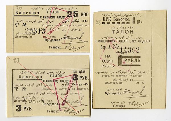 Russia (Transcaucaia - Baku, Azerbaijan). Lot includes 3 so-called "tickets for a named (product) order", with values 25 Kopeks, 1 Ruble, and 3 Rubles. The 1 Ruble vertical and larger format than the other two. All uniface and bearing "NOT VALID" cancellation handstamp. Very Fine.