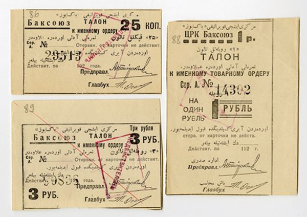 Russia (Transcaucaia - Baku, Azerbaijan). Lot includes 3 so-called "tickets for a named (product) order", with values 25 Kopeks, 1 Ruble, and 3 Rubles. The 1 Ruble vertical and larger format than the other two. All uniface and bearing "NOT VALID" cancellation handstamp. Very Fine.