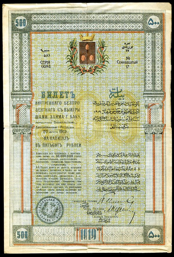Azerbaijan, local issue “interest free” bond, 500 Roubles, 1919, City Council promises to pay back principal and “winnings” but don't call them interest. Large and very unusual. VF.
