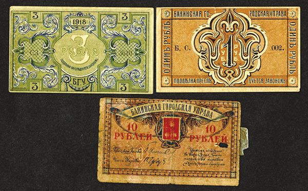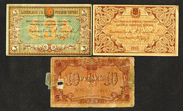 Azerbaijan, Russia. Lot of 3 notes, Includes 1 Ruble, P-S721, AU to AU+; 3 Rubles, P-S722, AU to AU+ and 10 Rubles, PS724, Fine with small hole, stamp hinge remnants, still scarce notes in high grade. (The Pogrebetsky Family Archives)