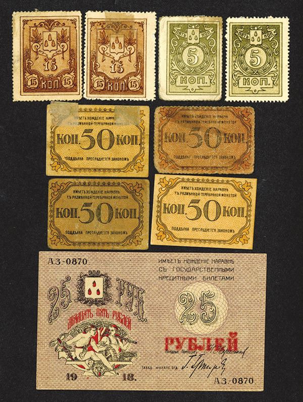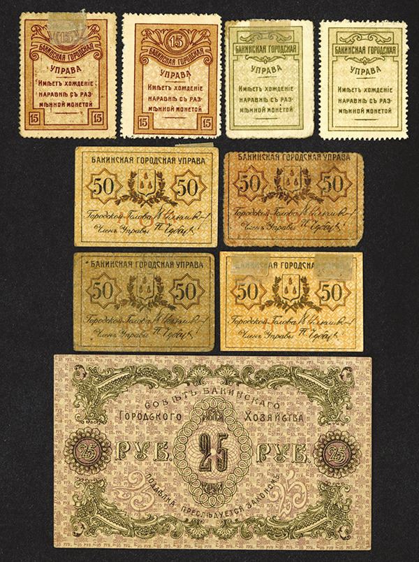 Russia - Transcaucasia. 5, 15, 50 Kopeks. P-S726 (2), S727 (2), S728 (4); Fine or better, many with hinges; Soviet Baku City Administration. 1918 Issue, 25 Rubles. Choice Very Fine or better. 8 pieces. (The Pogrebetsky Family Archives)