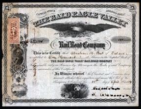 Pennsylvania. 1864. 100 Shares, #126, Black, Dynamic spread winged Eagle on top, Washington on left and wood chopper taking break on bottom. Toning on left border due to glue staining, other wise in fine condition. Punched Cancelled, Revenue Stamp attached. Scarce and attractive.